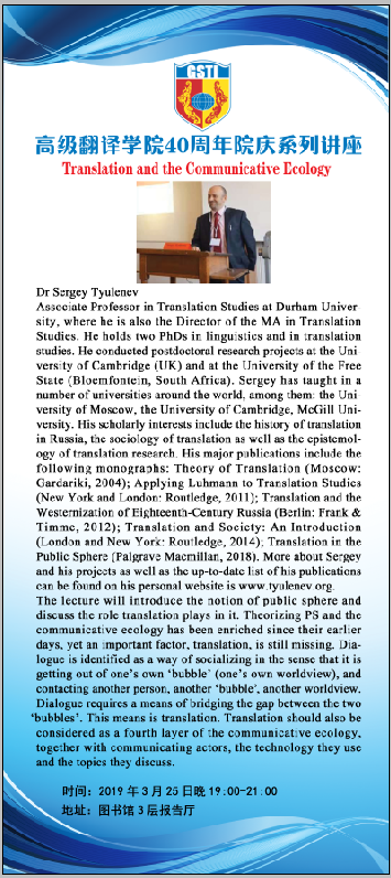 高翻学院(联合国译训部)四十周年院庆系列讲座——Sergey Tyulenev博士谈翻译与交际生态2019年3月25日晚,来自英国杜伦大学的副教授Sergey Tyulenev博士在图书馆三楼学术报告厅为北外学子带来了一场题为Translation and The Communicative Ecology的讲座。精彩的讲座吸引了众多对翻译研究感兴趣的师生,加深了大家对社会学视角下翻译研究的理解。开云kaiyun官方网站院长、博士生导师任文教授主持了讲座和问答环节。Tyulenev教授以...