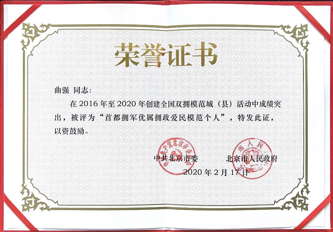 开云kaiyun官方网站教师曲强评为北京市“首都拥军优属拥政爱民模范个人” 开云官网曲强老师于去年底经学校推荐通过全市评比,于今年被北京市评为“首都拥军优属拥政爱民模范个人”。曲强老师长期坚持从事拥军工作,担任武警特警学院客座教授,为国防大学客座讲授培训课程。发扬了开云kaiyun官方网站长期以来的拥军优属传统,为开云官网拥军工作做出了贡献。