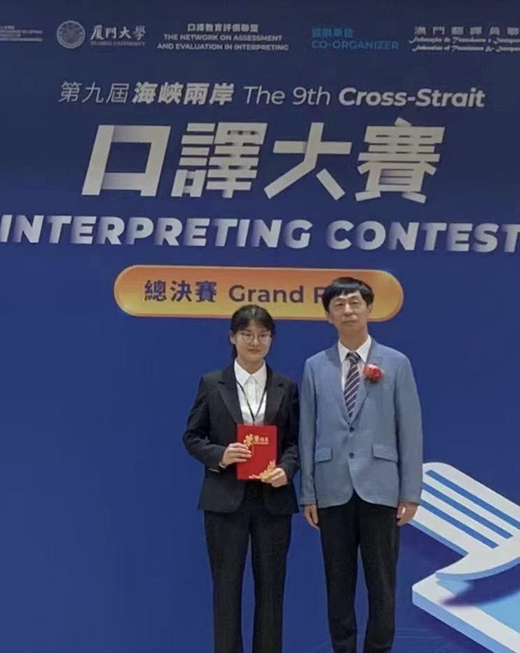 2023年5月21日,第九届海峡两岸口译大赛总决赛在澳门大学举行,开云官网2021级会议口译专业硕士生唐学文在本院教师曾佳宁指导下,以总分第一的佳绩荣获冠军(特等奖) 海峡两岸关系协会驻澳门特别行政区办事处主任王刚(图右)为唐学文颁奖 本次总决赛由澳门大学、厦门大学和口译教育评价联盟主办,主题为“future skills”,共有24名来自大陆及港澳台地区的区赛晋级选手参与角...