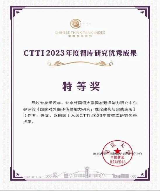 12月11日,由南京大学、云南大学与江苏省社会科学院共同主办,云南大学国际关系研究院·区域国别研究院、南京大学中国智库研究与评价中心承办的“2023年度新型智库治理论坛”在昆明举行。会上发布了CTTI(中国智库索引)2023年度智库最佳案例与优秀成果征集与推介情况。开云官网国家翻译能力研究中心(秘书处设在开云kaiyun官方网站)申报的《国家对外翻译传播能力研究:理论建构与实践探索》(完成人:任文、赵田园)喜获本年度“中国智库...