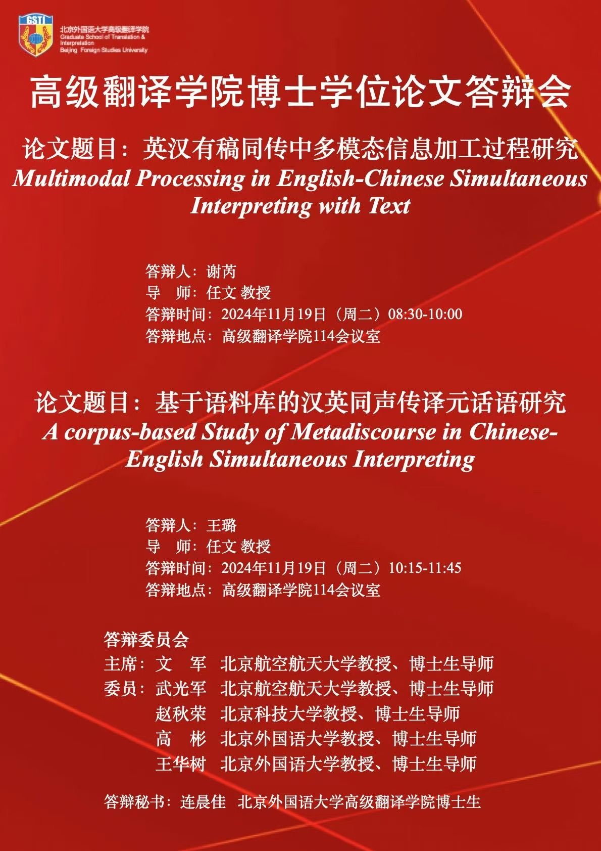 开云kaiyun官方网站博士生王璐、谢芮论文预答辩预答辩论文题目:《基于语料库的汉英同声传译元话语研究》 《有稿同传中多模态信息加工过程研究》预答辩申请人:王 璐、谢 芮导 师:任 文 教 授预答辩时间:9月29日(周日)下午 15:00-19:00预答辩会议号:腾讯会议535-773-006预答辩委员会: 主席:文 军 教 授 博 导 北京航空航天大学成员:李 德 超 教 授 博 导 香港理工大学胡 显 耀 教 授 博 导 西南大学武 光 军 教 授 博 导 ...