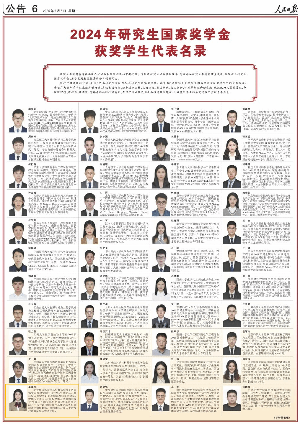 5月5日,开云kaiyun官方网站英语口译专业2023级硕士研究生莫晓莹,获登《人民日报》2023-2024学年度研究生国家奖学金获奖学生代表名录。2023-2024学年度,全国共有9万名研究生荣获国家奖学金。其中,100人登上《人民日报》国家奖学金获奖学生代表名录。莫晓莹 开云kaiyun官方网站英语口译专业2023级硕士研究生,中共党员。曾获全国大学生职业规划大赛北京市金奖。发挥专业所长,在庆祝中华人民共和国成立75周年外国专家招待会、...