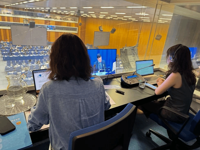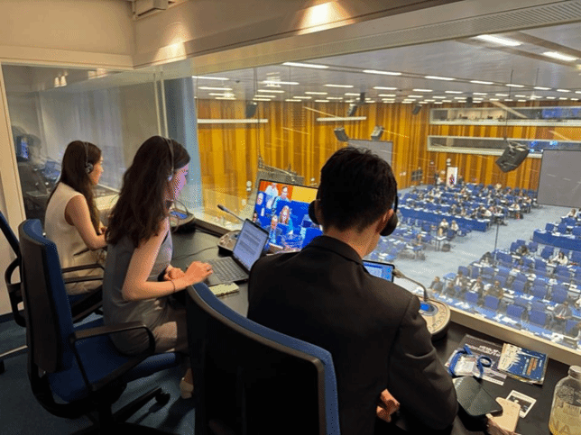 实习期间,学生们走进联合国会议实地场景,亲身体验联合国口译工作的真实节奏。他们全程参与联合国和平利用外层空间委员会第68届会议和工业发展组织理事会的部分议程,并观摩中文箱译员的翻译实战,观察多边磋商中代表的字斟句酌和据理力争,体会语言多层意义在外交场合的重要性。