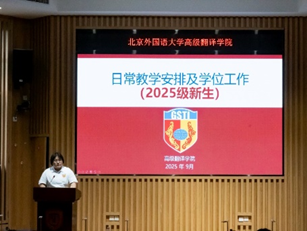 9月2日上午,高翻学院2025级新生开学典礼隆重举行,学院领导、教师代表、校友代表、以及全体硕博新生齐聚一堂,共同见证这一重要时刻。师长们勉励新同学要胸怀家国、志存高远,苦练内功、追求卓越,坚守初心、立德修身,秉持“译以载道,砺思志远”的院训精神,努力成为有家国情怀、有全球视野、有专业本领的复合型高级翻译人才。