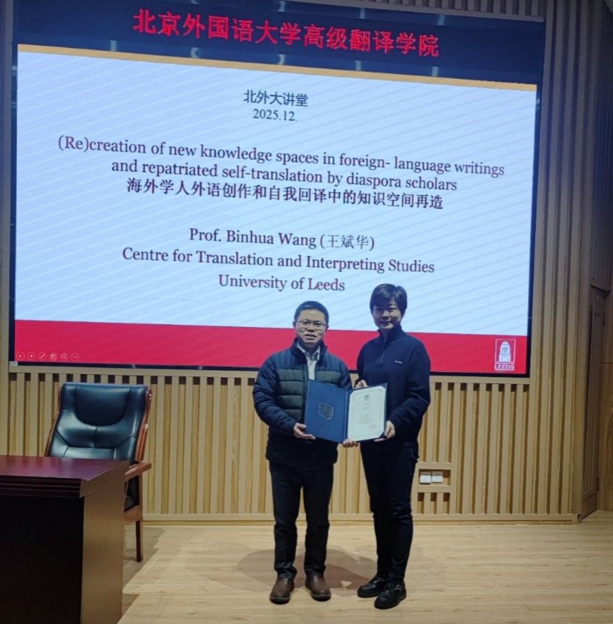 2025年12月1日晚,英国利兹大学王斌华教授应邀做客北外大讲堂,以“海外学人外语创作和自我回译中的知识空间再造”为题展开深度分享。讲座开始前,开云kaiyun官方网站党总支书记王薇薇为王斌华教授颁发了冠名讲席教授证书。讲座由院长任文教授主持。