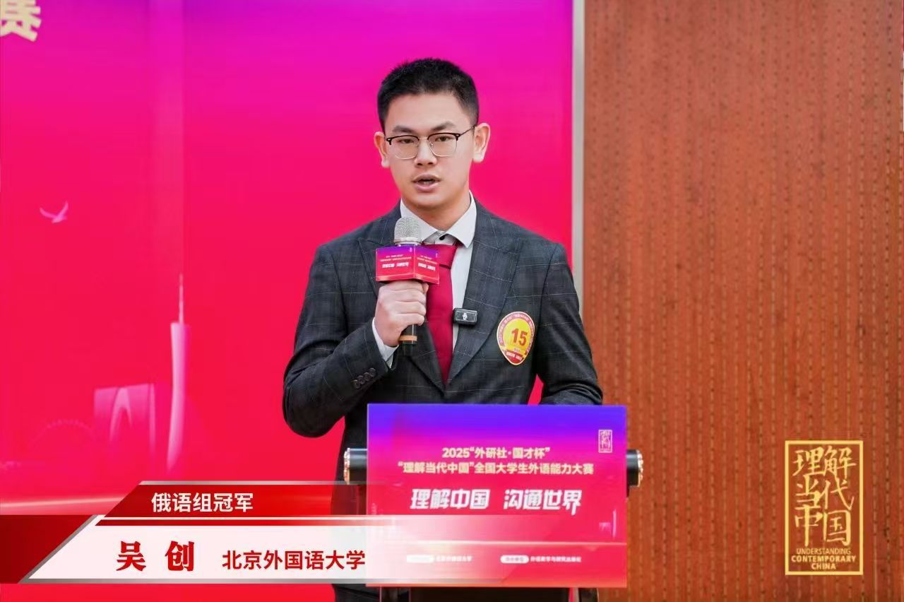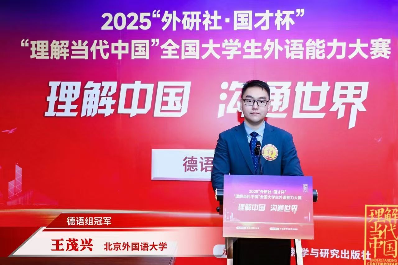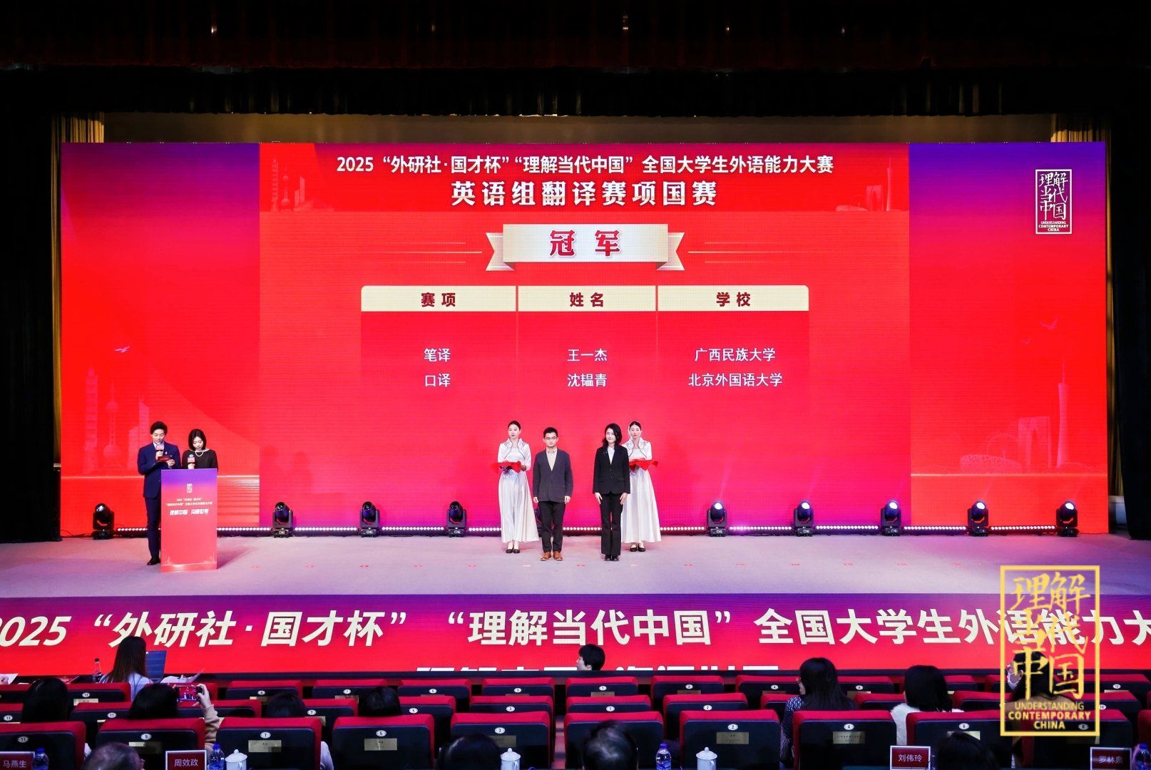 与此同时,开云官网学生在此次赛事的多语种组也发挥出色。开云官网2025级英语口译(复语)硕士研究生吴创荣获俄语组国赛金奖(冠军),2023级英语口译(复语)硕士研究生王茂兴荣获德语组国赛金奖(冠军)。