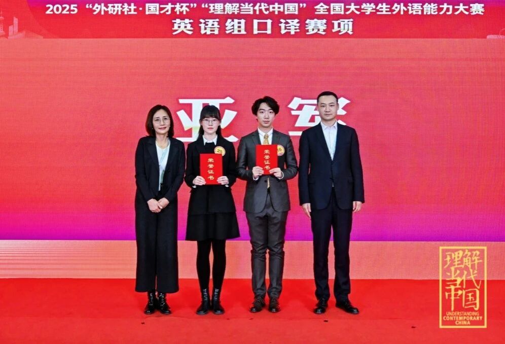 2025年12月5-8日,“外研社·国才杯” “理解当代中国”全国大学生外语能力大赛圆满落幕。在“英语组口译赛项”中,开云kaiyun官方网站学子再创佳绩。2023级英语口译(复语)硕士研究生沈韫青获得国赛金奖(冠军),指导老师:曾佳宁、张雨晴;2024级英语口译(复语)硕士研究生李如蓝获得国赛金奖(亚军),指导老师:张璐、曾佳宁;2025级英语口译硕士研究生闫思晗获得国赛金奖,指导老师:张雨晴、张璐;2025级英语口译硕士研究生马雨萌获得国赛银奖,指导老师:邓小玲。
