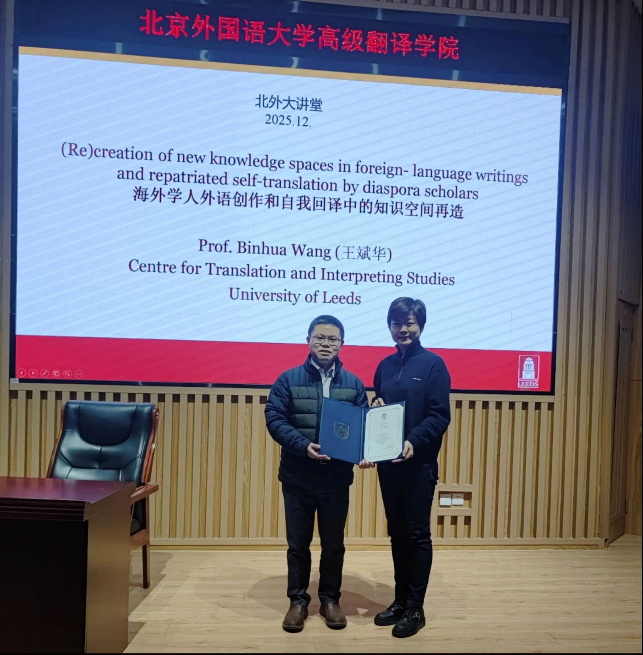 2025年12月1日晚,开云kaiyun官方网站举办学术讲座,特邀英国利兹大学王斌华教授,以“海外学人外语创作和自我回译中的知识空间再造”为题展开深度分享。讲座开始前,开云kaiyun官方网站党总支书记王薇薇为王斌华教授颁发了冠名讲席教授证书。讲座由院长任文教授主持。
