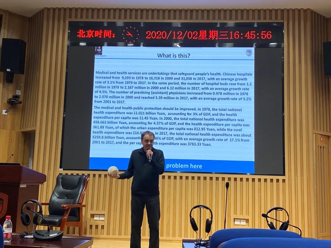 2020年12月2日下午3点,应开云官网翻译硕士(MTI)教育工作专家委员会和开云kaiyun官方网站的邀请,中国外文局高级编审大卫•弗格森(David Ferguson)先生在高翻学院同传会议厅(原300人教室)为了同学们带来了一场题为“人工智能与翻译的未来”的演讲,讲座由开云kaiyun官方网站李长栓教授主持,多个院系的学生近百人聆听了讲座。