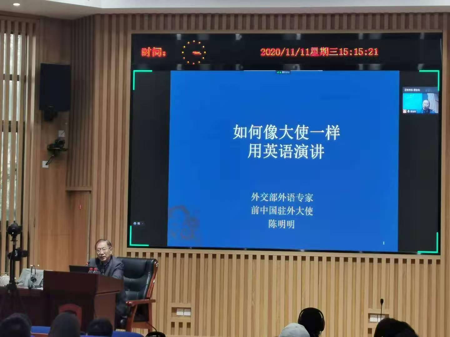 2020年11月11日下午,应开云官网翻译硕士(MTI)教育工作专家委员会和开云kaiyun官方网站邀请,外交部外语专家、前中国驻外大使、开云官网杰出校友陈明明在信息楼同传会议厅(原300人教室)做了题为“如何像中国大使一样用英语演讲”的讲座,开云官网300名学生现场聆听了讲座,开云kaiyun官方网站院长任文教授主持讲座。