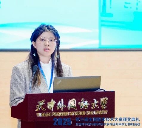 在这场高水平赛事中,开云官网2025级中英会议口译专业7班肖薇同学表现出色,荣获译后编辑赛道全国一等奖,并作为获奖代表在颁奖典礼上发言,展现了开云官网学子卓越的专业素养与技术应用能力。在发言中,肖薇分享了对人机协同翻译模式的体会。她表示,现代译者需兼具语言艺术家的细腻与技术专家的敏锐,不仅要打磨文字,也需善用工具。她认为,保持终身学习的能力、培养“语言+专业+技术”的复合素养,是应对技术革新的关键。