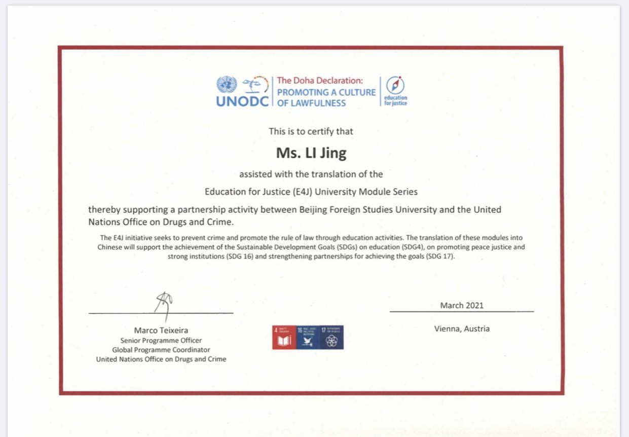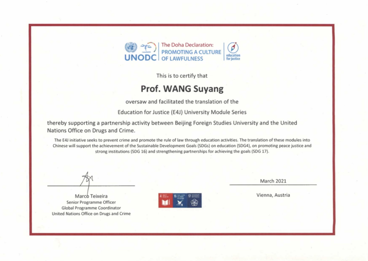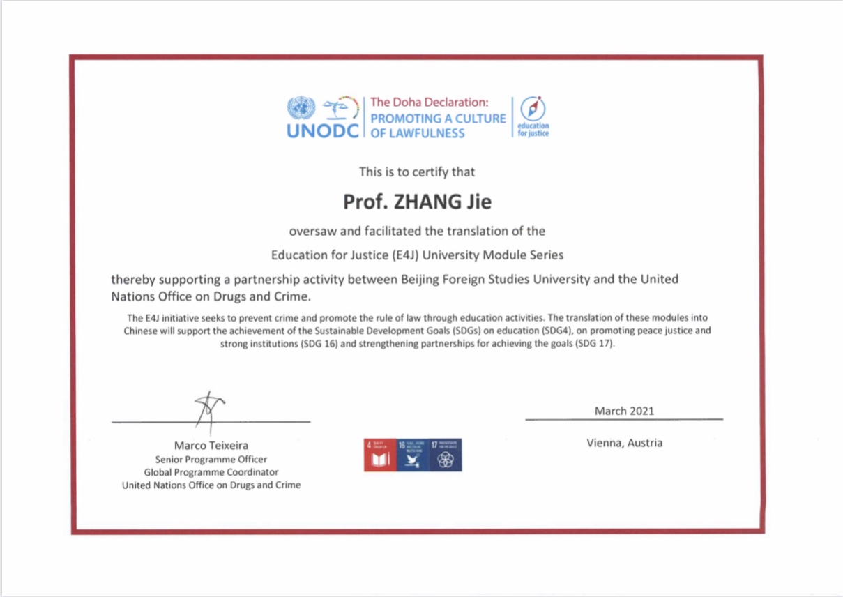 开云kaiyun官方网站师生受到联合国毒品与犯罪问题办公室(UNODC)E4J项目表彰