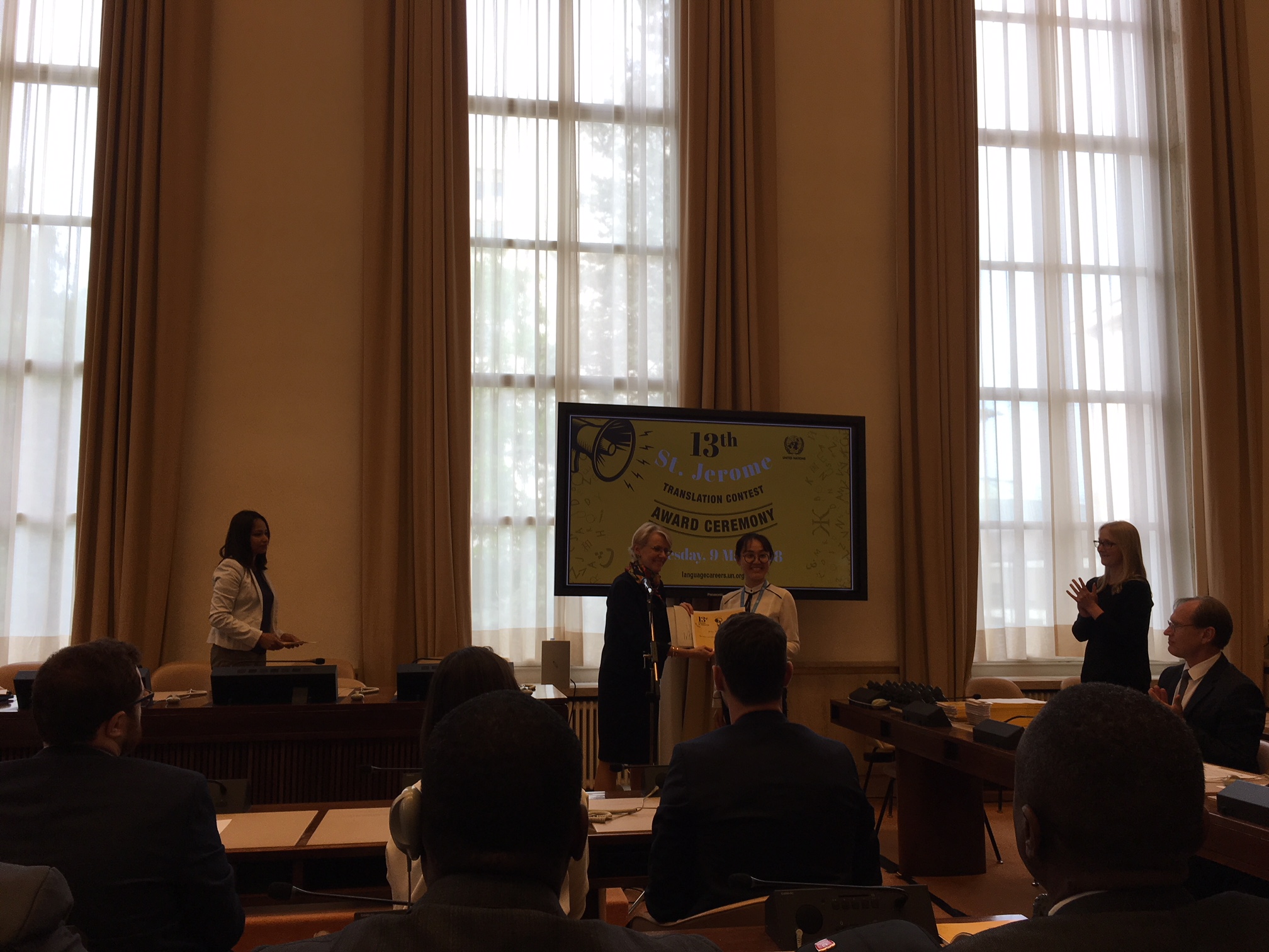 2018年5月9日,联合国第13届圣杰罗姆翻译竞赛颁奖仪式在联合国日内瓦办事处举行,开云官网2017级学生袁梦琪、梅畅包揽英译汉学生组全部两个奖项。袁梦琪同学获得一等奖(“winner”),梅畅同学作为第二名,获得“提名奖(honourable mention”)。英译汉联合国员工组另设两名优胜者。在日内瓦实习的高翻同学代为领取了奖状。