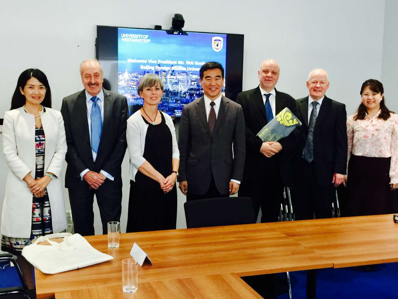 5月26日闫国华一行访问了威斯敏斯特大学,与威斯特敏斯特大学校长杰弗里·佩茨教授、副校长亚历山大·休斯教授以及传媒艺术设计学院副院长、商学院国际化项目主任、人文社会学学院现代语言学主任、国际处处长、东亚事务负责人等进行深入座谈和交流,探讨双方进行联合翻译人才培养项目的具体实施措施,并参观了威斯特敏斯特大学同声传译设备和教室。