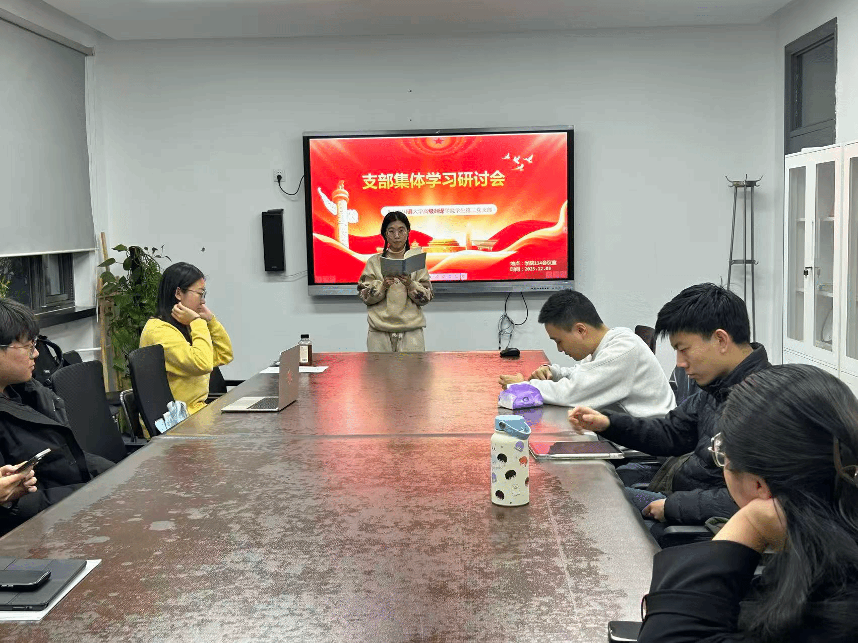12月12日,学生第二党支部在114会议室召开专题理论学习会,集中研学习近平新时代中国特色社会主义思想及相关重要论述。与会党员深刻认识到“没有中国共产党,就没有中华民族的伟大复兴”,并一致认为应发挥外语院校特长,将语言能力转化为阐释中国、联结世界的专业优势,在跨文化交流与全球治理中贡献力量。