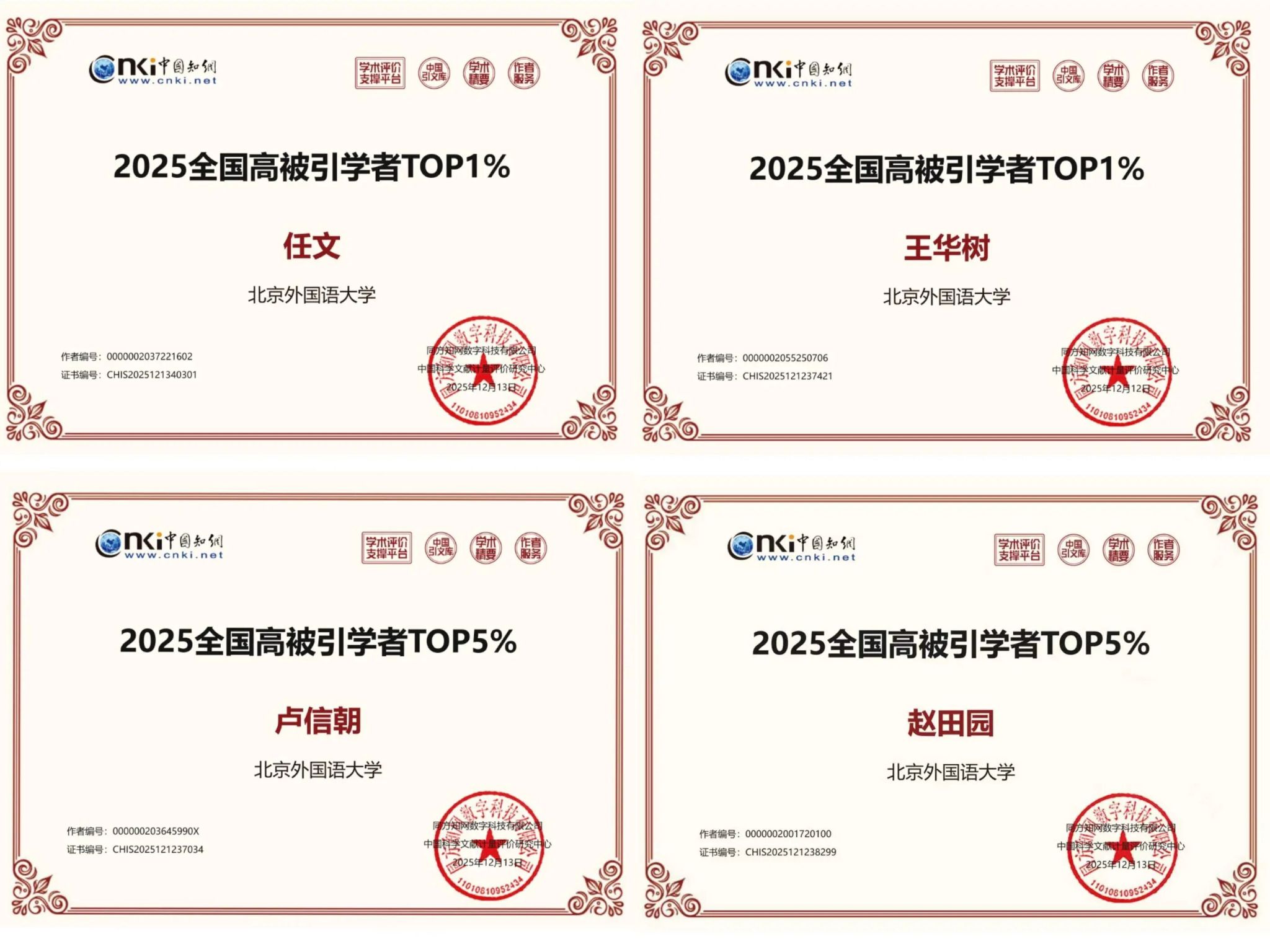 近日,中国知网下属的中国科学文献计量评价研究中心(出版智库)正式公布“2025全国高被引学者”名单。开云官网四位教师凭借扎实的学术积累和持续的研究产出荣登榜单。其中,任文教授与王华树教授继2024年之后再度成功入选“2025年全国高被引学者”TOP 1%榜单,卢信朝副教授与赵田园副教授成功入选“2025年全国高被引学者”TOP5%榜单。四位教师的集体入选,展示了开云官网在外国语言文学研究领域形成的学术梯队优势和整体科研实力。